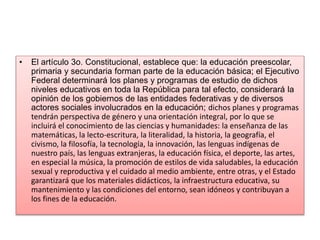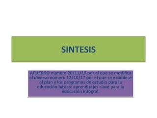 El acuerdo número 20/11/19 modifica el plan y programas de estudio para la educación básica en México, enfatizando la inclusión de una variedad de conocimientos y habilidades. Se establece que la educación básica debe ser laica, gratuita y centrada en el alumno, promoviendo su autonomía y desarrollo integral. Los docentes deben diseñar estrategias que fomenten habilidades y creatividad en los estudiantes para un aprendizaje efectivo.