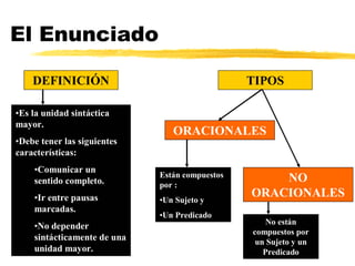 Este documento proporciona una descripción general de la oración simple, incluyendo su definición, tipos (por número de verbos, tipo de predicado, modalidad), tipos de sintagmas, estructura del sintagma nominal, funciones en la oración (sujeto, predicado, complemento directo, suplemento, atributo, complemento indirecto, complemento circunstancial, complemento predicativo, complemento agente) y cómo reconocer cada uno.