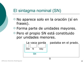 El sintagma nominal (SN) se compone de una palabra o grupo de palabras agrupadas en torno a un núcleo sustantivo. El SN incluye elementos opcionales como determinantes, adjetivos u otros modificadores que rodean el núcleo sustantivo central. El orden típico de los elementos en el SN es: determinante, núcleo sustantivo, modificadores adyacentes.