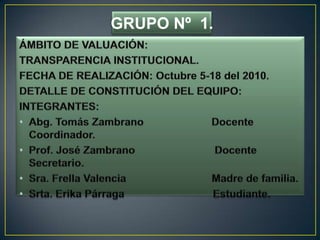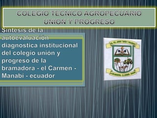 Este documento presenta un resumen del proceso de autoevaluación diagnóstica institucional realizado por el Colegio Técnico Agropecuario "Unión y Progreso" en El Carmen, Manabí, Ecuador. Se conformaron seis grupos de evaluación para examinar áreas como transparencia, orientación estratégica, recursos, empatía y generación de valor. Los grupos completaron el proceso de evaluación en octubre de 2010 y presentaron informes. Luego se elaboró un informe global final.