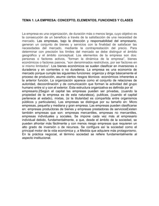 -422910-318770<br />SINTESIS<br />ING. GESTION EMPRESARIAL<br />Materia: Fundamentos de Gestión Empresarial<br />Profesor: DR. Ezequiel Villalobos Vázquez<br />Alumno: Javier Nicolás Lorenzo<br />Turno: Matutino<br />Grupo: A <br />Tuxtepec Oaxaca                           08/0ctubre/2011<br />TEMA 1. LA EMPRESA: CONCEPTO, ELEMENTOS, FUNCIONES Y CLASES<br />La empresa es una organización, de duración más o menos larga, cuyo objetivo es la consecución de un beneficio a través de la satisfacción de una necesidad de mercado. Las empresas, bajo la dirección y responsabilidad del empresario, generan un conjunto de bienes y servicios con la finalidad de satisfacer las necesidades del mercado, mediante la contraprestación del precio. Para determinar con precisión los límites del mercado se debe distinguir el ámbito geográfico y el ámbito conceptual. Los elementos de la empresa son dos: personas o factores activos, “forman la dinámica de la empresa”, bienes económicos o factores pasivos, “son denominados restrictivos, por ser factores en si mismo limitados”. Los bienes económicos se suelen clasificar en inversiones o duraderos y en corrientes o no duraderos. La empresa es una economía de mercado porque cumple las siguientes funciones: organiza y dirige básicamente el proceso de producción, asume ciertos riesgos técnicos -económicos inherentes a la anterior función. La organización aparece como el conjunto de relaciones de autoridad, decoordinación y de comunicación que forman la actividad del grupo humano entre sí y con el exterior. Esta estructura organizativa es definida por el<br />empresario.2Según el capital las empresas pueden ser privadas, (cuando la propiedad de la empresa es de esta naturaleza), publicas, (cuando el capital pertenece al estado), mixtas, (si la titularidad es compartida entre organismos públicos y particulares). Las empresas se distingue por su tamaño en: Micro empresas, pequeña y mediana y gran empresa. Las empresas pueden clasificarse en: empresas productoras de bienes y empresas prestadoras de serviciosExisten también empresas que son: empresas mercantiles, empresas no mercantiles, empresas individuales y sociales. Se impone cada vez más al empresario individual debido, fundamentalmente, a que, desde el ámbito de la sociedad, se pueden afrontar más fácilmente y con menos riesgo empresas que requieren un alto grado de inversión o de recursos. Se configura así la sociedad como el principal motor de la vida económica y, a Medida que adquiere más protagonismo. En la práctica negocial, el término sociedad se refiere fundamentalmente al aspecto institucional.<br />