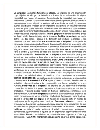 Este documento resume los conceptos básicos de una empresa, incluyendo sus elementos, funciones y clases. Explica que una empresa es una organización cuyo objetivo es generar beneficios a través de satisfacer las necesidades del mercado. Detalla los elementos de una empresa como las personas, bienes activos y factores pasivos. También describe las funciones básicas de una empresa como organizar la producción y asumir riesgos. Finalmente, clasifica las empresas según su propiedad, tamaño y otros criterios, como empresas privadas, públicas y mixtas.