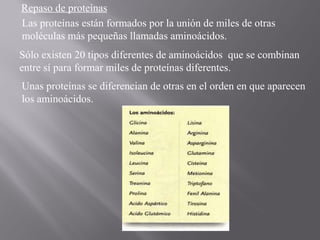 El documento describe el proceso de síntesis de proteínas en dos etapas. Primero, la transcripción convierte el ADN en ARN mensajero en el núcleo. Luego, la traducción usa el ARN mensajero para ensamblar proteínas a partir de aminoácidos en el citoplasma, mediante la lectura del código genético en tripletes de nucleótidos llamados codones. El proceso garantiza que la información genética se expresa correctamente en las proteínas de la célula.