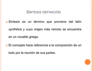 Este documento define la síntesis y proporciona instrucciones para realizarla. Explica que la síntesis es un resumen más elaborado que resume las ideas principales de un texto usando las propias palabras en lugar de citar directamente. Luego, detalla los pasos para sintetizar un texto, los beneficios de esta técnica y algunas recomendaciones para aplicarla.