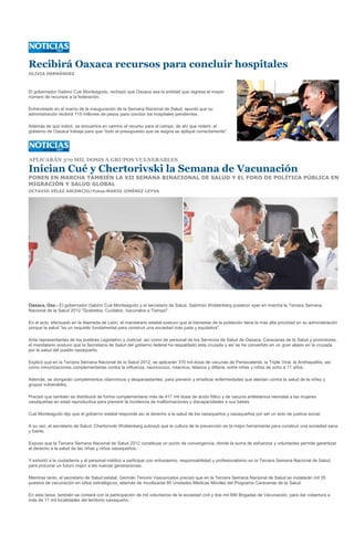 El gobernador de Oaxaca, Gabino Cué Monteagudo, asistió a la toma de protesta del nuevo gobernador de Morelos, Graco Ramírez. Cué deseó suerte a Ramírez y expresó su confianza en que trabajará con dedicación. Además, los pueblos de Santiago Textitlán y Santiago Amoltepec en Oaxaca firmaron un acuerdo de paz que permitirá abrir un nuevo camino entre los pueblos, ahorrando tiempo de viaje. Finalmente, el secretario general de Gobierno elogió el ac