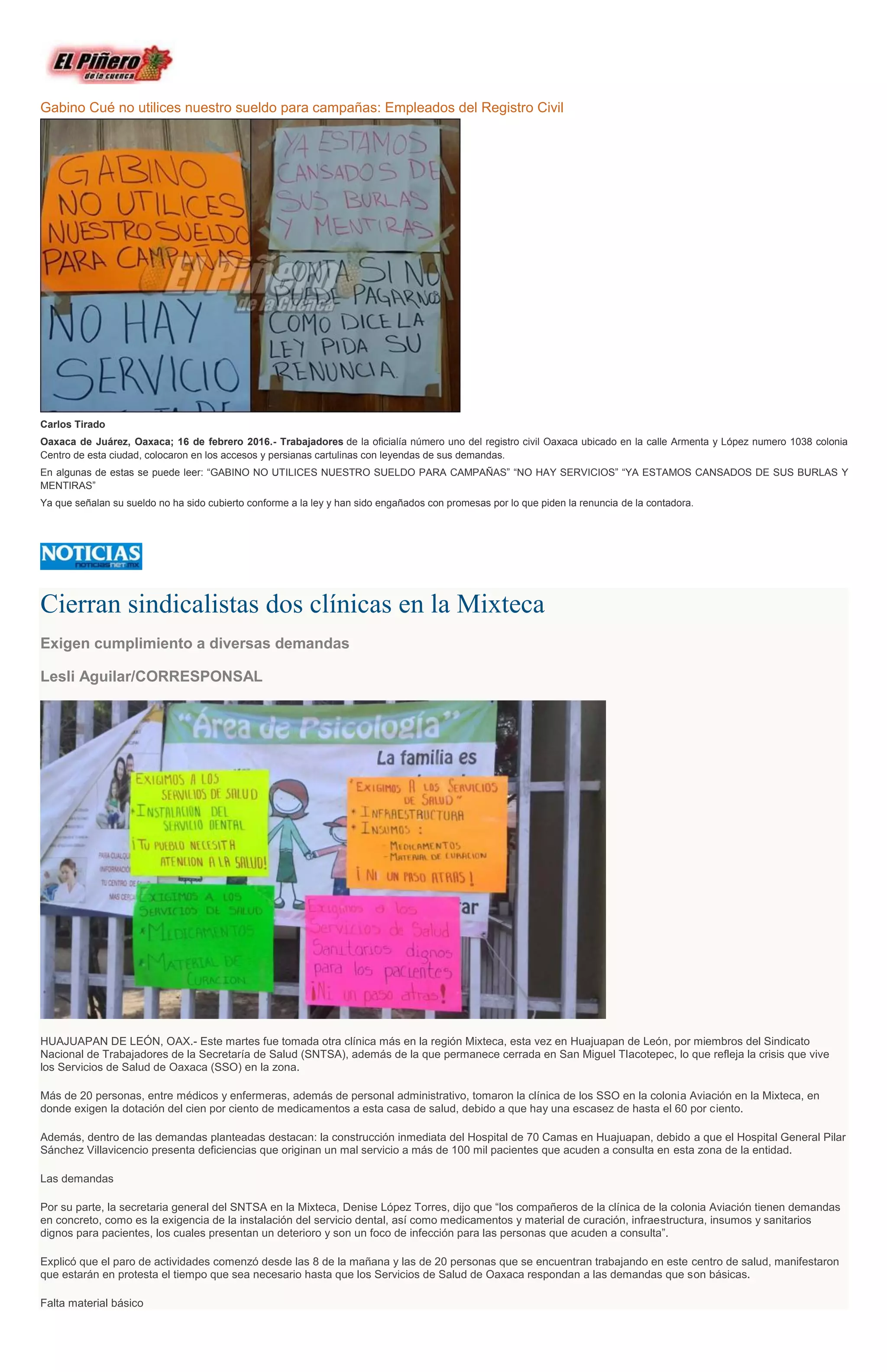 Los empleados del Registro Civil de Oaxaca protestan porque su sueldo está siendo utilizado para campañas políticas sin su consentimiento. Sindicalistas cierran dos clínicas en la región de Mixteca debido a la falta de medicamentos y material médico básico. El magisterio amenaza con un paro indefinido el 29 de febrero si el IEEPO no atiende sus demandas salariales y de libertad para cuatro maestros encarcelados.