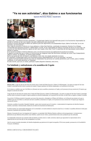 (1) El gobernador de Oaxaca, Gabino Cué, reprendió a funcionarios responsables de atender el conflicto en San Juan Copala y les pidió colaborar para resolverlo. (2) También les dijo que "ya no son activistas, son funcionarios". (3) En una reunión, el agente municipal de San Juan Copala advirtió que entre los desplazados hay personas con cuentas pendientes y no se puede garantizar su integridad a pesar de medidas cautelares.