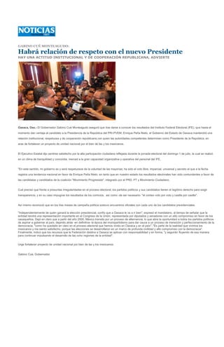 El documento resume las declaraciones del gobernador de Oaxaca, Gabino Cué Monteagudo, sobre los resultados electorales de las elecciones presidenciales del 1 de julio de 2012. Cué dice que mantendrá una relación de respeto y cooperación con el nuevo presidente, sea quien sea. Reconoce la tendencia a favor del candidato del PRI Enrique Peña Nieto pero respeta la voluntad popular. Cué también advierte que el triunfo de Peña Nieto no dará impunidad a exfuncionarios investigados y que se seguirá respetando la alternancia