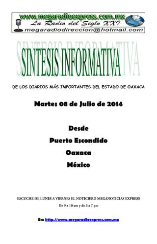 El documento resume las protestas recientes en Oaxaca, México, donde miembros del Frente Popular Revolucionario retuvieron al representante de UNICEF y al gobernador Gabino Cué en el Palacio de Gobierno para exigir que se cumplan las promesas del gobierno. La policía no intervino. Más tarde, funcionarios tuvieron que negociar con los manifestantes para liberar a los retenidos. El documento también critica la falta de autoridad del gobernador y la anarquía en el comercio informal frente al palacio.