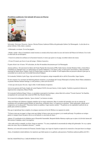 El documento resume la audiencia pública del gobernador Gabino Cué en la que atendió 60 casos de 393 solicitudes en 8 horas. Se mencionan varios líderes políticos que asistieron y los temas que presentaron, como proyectos educativos y pagos atrasados. También se describe una protesta estudiantil fuera del palacio de gobierno exigiendo apoyo para su escuela. El gobernador anuncia que evaluará a su gabinete después de su primer informe y que podría haber cambios.