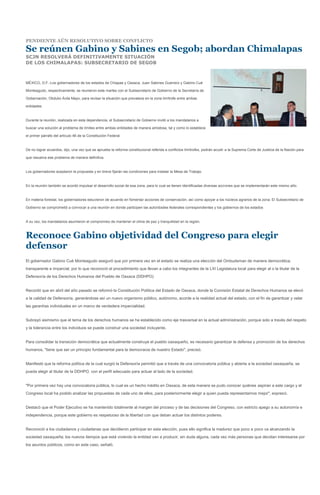Los gobernadores de Chiapas y Oaxaca se reunieron con el Subsecretario de Gobernación para discutir el conflicto limítrofe entre los estados en la zona de Los Chimalapas. De no lograr un acuerdo, la Suprema Corte de Justicia de la Nación resolverá definitivamente la situación. Los gobernadores aceptaron instalar una mesa de trabajo para buscar una solución amistosa y también acordaron impulsar el desarrollo social de la zona.