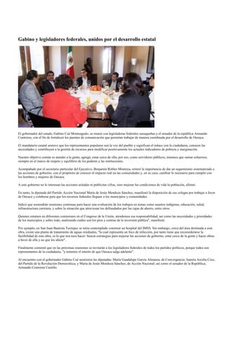 El gobernador de Oaxaca, Gabino Cué, se reunió con legisladores federales para fortalecer la coordinación entre el gobierno estatal y el federal y trabajar juntos por el desarrollo de Oaxaca. También anunció la creación de un centro de operaciones para cónsules honorarios con el fin de mejorar la comunicación y promover el intercambio comercial, académico, cultural y turístico. Finalmente, Cué aseguró que no habrá pagos extras a funcionarios, sólo los salarios establecidos por ley