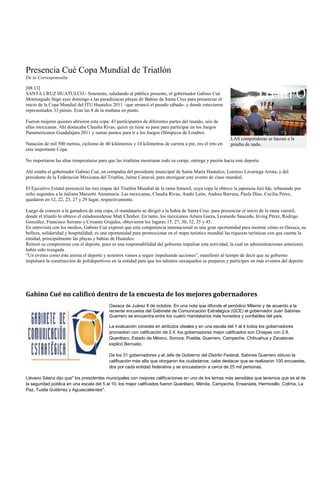 El gobernador Gabino Cué asistió a la Copa Mundial de Triatlón en Huatulco, donde compitió mujeres y luego hombres. Las mexicanas Claudia Rivas y Anahí León tuvieron buenos resultados. Más de 300 municipios se beneficiarán con recursos combinados para obras, casi el doble que antes. La SCT reconoció que el presupuesto de carreteras en Oaxaca se está aplicando a tiempo con 2,500 millones de pesos planeados para este año. El gobierno estatal ejecuta directamente 42 mil millones