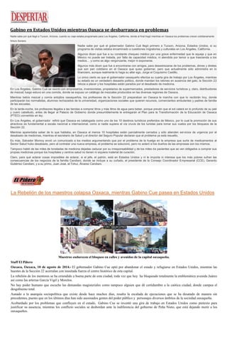 El documento presenta tres historias relacionadas con la situación política en Oaxaca, México. La primera historia trata sobre el gobernador de Oaxaca, Gabino Cué, quien se encuentra de viaje en Estados Unidos mientras Oaxaca enfrenta problemas políticos y de salud pública. La segunda historia describe las protestas crecientes de la Sección 22 en Oaxaca que están paralizando la ciudad. La tercera historia cubre la reforma energética del gobierno federal y contrasta esto con los desafíos de implementar la reforma educativa debido