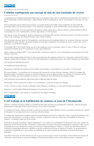 El documento describe la respuesta de emergencia a los daños causados por las tormentas Manuel e Ingrid en Oaxaca, México. Más de 15,000 personas resultaron afectadas y 29 comunidades quedaron incomunicadas. Los gobiernos federal y estatal distribuyeron más de 100 toneladas de víveres y suministros médicos a través de puentes aéreos y terrestres. Además, se informa sobre daños en caminos y puentes, y sobre comunidades en la Mixteca que permanecen incomunicadas debido a derr