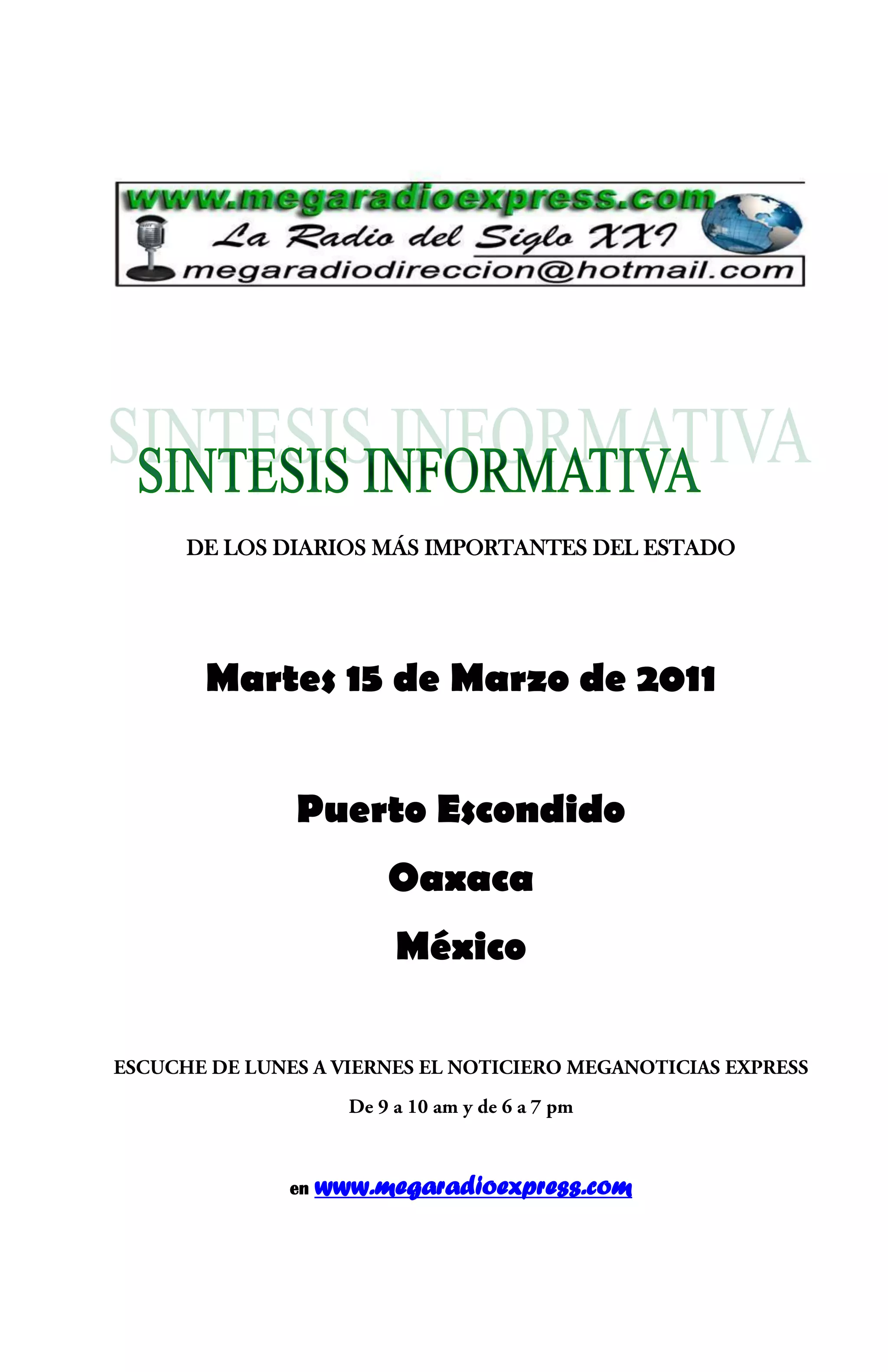 El documento presenta varias noticias relacionadas con el estado de Oaxaca, México. Incluye una nota sobre el gobernador Gabino Cué que habla sobre generar condiciones de paz y progreso en el estado. Otra nota indica que los Servicios de Salud de Oaxaca darán más de 700,000 vacunas antirrábicas esta semana. Finalmente, la comunidad de Eloxochitlán exige que se cumplan los acuerdos sobre la integración de concejales al ayuntamiento.