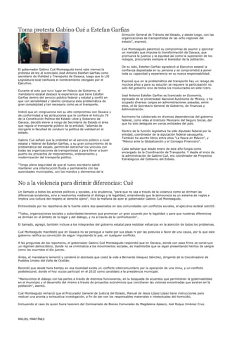 El gobernador Gabino Cué Monteagudo entregó 6.48 millones de pesos para financiar programas culturales. Nombró a José Antonio Estefan Garfias como nuevo Secretario de Vialidad y Transporte de Oaxaca. Además, Cué Monteagudo llamó a resolver diferencias mediante el diálogo y no la violencia, y condenó el asesinato de un dirigente comunitario en Oaxaca.