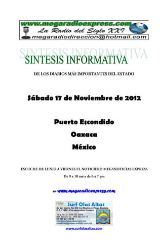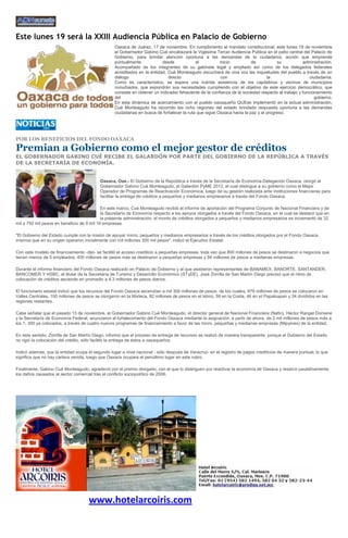 Este documento contiene información sobre varios temas relacionados con el gobierno del estado de Oaxaca, México. Se anuncia que el gobernador Gabino Cué encabezará la 23a Audiencia Pública para escuchar las inquietudes ciudadanas. También se informa que el gobierno de Oaxaca recibió un galardón por ser el mejor gestor de créditos a través del Fondo Oaxaca, beneficiando a miles de pequeñas empresas. Finalmente, un diputado exige explicaciones a la Secretaría de Contraloría sobre la auditoría