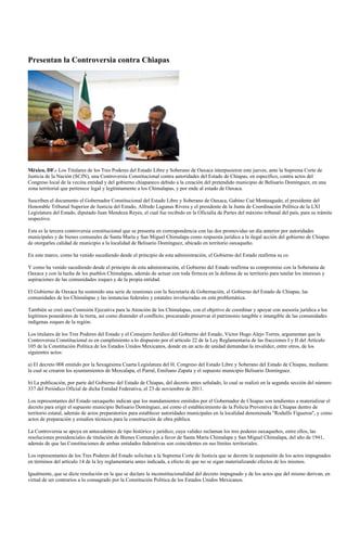 Los titulares de los tres poderes de Oaxaca presentaron una controversia constitucional ante la Suprema Corte de Justicia de la Nación contra Chiapas por la creación del municipio de Belisario Domínguez en territorio que pertenece a Oaxaca. El secretario de gobierno de Chiapas dijo que la controversia no les preocupa porque cuentan con documentos históricos que demuestran que el territorio pertenece a Chiapas. Mientras tanto, la contralora de Oaxaca fue nombrada coordinadora regional de contralores de varios estados del centro y
