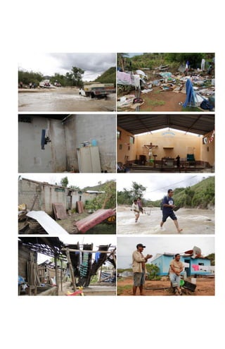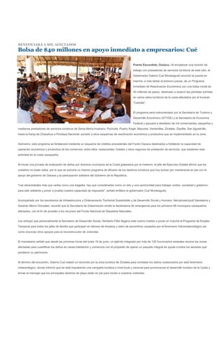 El documento describe los esfuerzos del gobernador de Oaxaca, Gabino Cué, para brindar asistencia a las personas afectadas por el huracán Carlotta en la costa de Oaxaca. Anuncia una bolsa de $40 millones de pesos para apoyar a mil comerciantes y prestadores de servicios turísticos afectados. También describe la evaluación de daños en la zona y los planes del gobierno para brindar apoyo como láminas, programas de empleo temporal y créditos para reconstrucción.