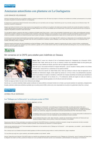 El documento resume varias noticias relacionadas con la educación en Oaxaca. La organización Antorcha Campesina amenaza con permanecer en plantón durante el festival de La Guelaguetza si el gobierno no autoriza 180 obras comunitarias. No hay consenso dentro de la CNTE sobre un paro indefinido. Los "Diálogos por la Educación" convocados por el Congreso buscan escuchar a todos los sectores para elaborar una nueva ley estatal de educación. Un estudio del Banco Mundial encuentra que la educación media superior en
