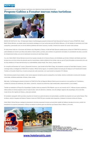 El gobernador Gabino Cué presentó varios proyectos turísticos estratégicos a FONATUR para atraer inversiones y posicionar a Oaxaca como destino preferido. Entre los proyectos se encuentran la ampliación del Corredor Turístico La Crucecita-Santa Cruz, el plan de negocios Marina-Chahué, y la ampliación del Parque Eco-Arqueológico Copalita. Además, la Sedafpa entregó 22 millones de pesos en apoyos a cerca de 11,000 productores afectados por