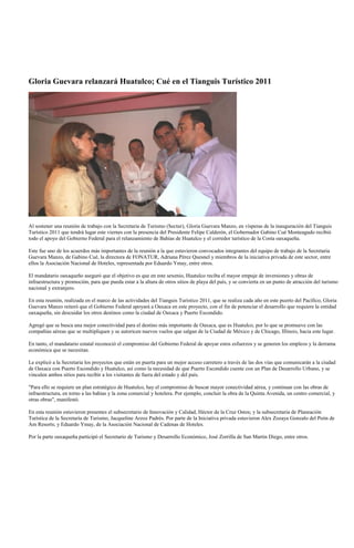 1) La Secretaria de Turismo de México, Gloria Guevara, se reunió con el Gobernador de Oaxaca, Gabino Cué, para apoyar el relanzamiento de Bahías de Huatulco y mejorar la conectividad aérea hacia el destino.