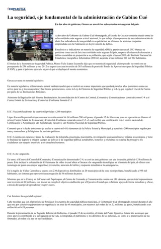 El documento habla sobre la seguridad pública en el estado de Oaxaca bajo la administración de Gabino Cué. Se menciona que Oaxaca es uno de los ocho estados más seguros del país y se espera que para el 2013 sea uno de los cinco estados más seguros. También se discuten los avances legislativos en materia de seguridad pública y la certificación de más de 4,000 policías a través del Centro Estatal de Evaluación y Control de Confianza. Finalmente, se mencionan las inversiones realizadas en el Centro de