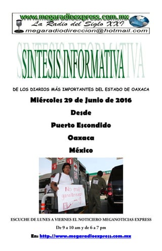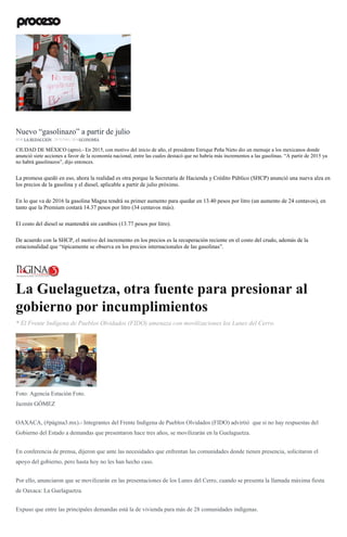 El documento informa sobre el aumento de precios en la gasolina en México a partir de julio de 2016, contradiciendo la promesa del presidente Peña Nieto de no más 'gasolinazos'. Además, se detalla la situación de movilizaciones docentes en Oaxaca, donde un 45% de las escuelas no laboraron debido a protestas relacionadas con la reforma educativa y demandas de mejor educación. También se menciona la respuesta del gobierno y la Comisión Nacional de Derechos Humanos sobre los bloqueos realizados por docentes y la necesidad de garantizar derechos de tránsito y educación en el estado.