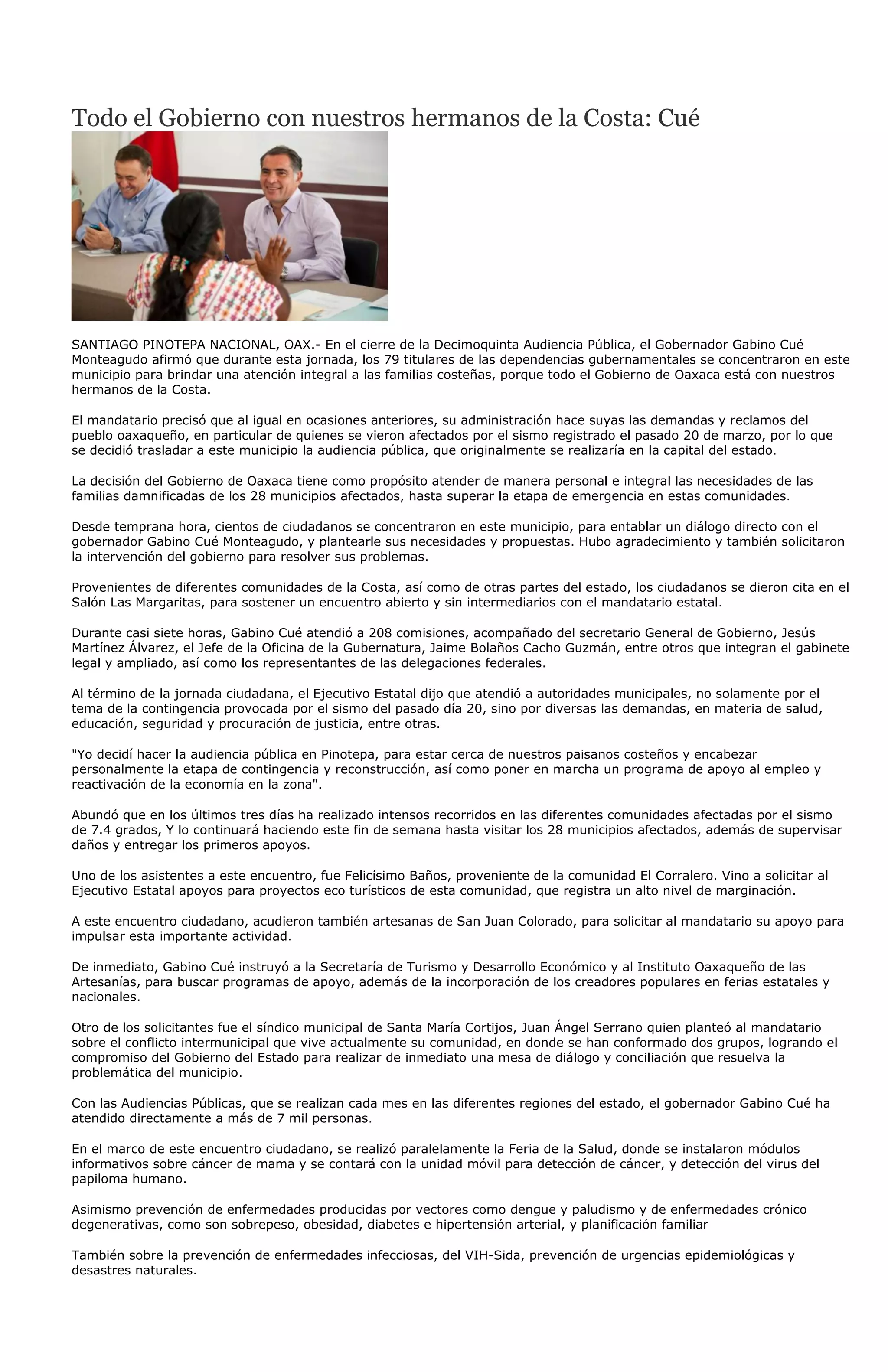 El gobernador de Oaxaca, Gabino Cué, celebró una audiencia pública en Pinotepa Nacional para atender personalmente las necesidades de las familias afectadas por el reciente terremoto en la costa de Oaxaca. Más de 200 comisiones se reunieron con el gobernador para plantear sus necesidades y solicitar apoyo del gobierno. El gobernador prometió continuar brindando apoyo a las comunidades afectadas a pesar de la veda electoral actual. También entregó 12 ambulancias a municipios costeros afectados.