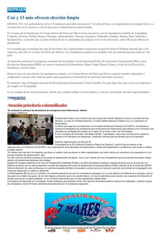 Los gobernadores de 14 estados mexicanos se comprometieron a respetar la ley y no intervenir en las elecciones del 7 de julio para garantizar su limpieza. Más de 15,000 funcionarios públicos de Oaxaca deben presentar su declaración patrimonial antes del plazo del 31 de mayo, aunque hasta ahora solo 10,000 lo han hecho. El modelo de desarrollo microrregional de Oaxaca para combatir la pobreza es considerado exitoso por el Banco Mundial siempre que no se contamine por corrupción o intereses partidistas.