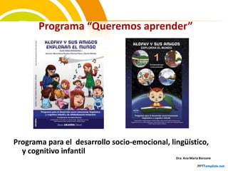 Este documento presenta un resumen de tres oraciones del programa "Queremos aprender" para el desarrollo infantil integral y la alfabetización temprana. El programa aborda el desarrollo de niños de manera holística a través de las dimensiones físico-motora, socioemocional y lingüística, utilizando actividades como juegos, canciones, lectura y escritura para apoyar el aprendizaje.