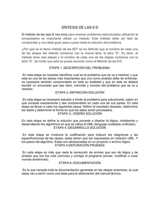 El documento describe el método de las 6 Ds para resolver problemas estructurados utilizando computadoras. El método consta de 6 etapas que comienzan con la letra D: 1) Descripción del problema, 2) Definición de la solución, 3) Diseño de la solución, 4) Desarrollo de la solución, 5) Depuración y pruebas, y 6) Documentación. Cada etapa se explica brevemente.