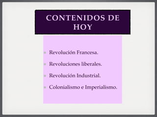 El documento resume las principales etapas de la historia y conceptos clave como revolución, Revolución Francesa, Revolución Industrial e Imperialismo/Colonialismo. Cubre las causas y etapas de la Revolución Francesa, así como su legado inmediato. Explica las características y consecuencias de la Primera y Segunda Revolución Industrial. Finalmente, define Imperialismo/Colonialismo y analiza sus causas y consecuencias.