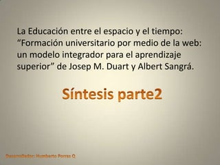 El documento describe un modelo integrador para la educación universitaria no presencial basado en la web. Los pilares del modelo son la acción docente, la evaluación continua y los materiales didácticos. El modelo se centra en el estudiante y requiere que los docentes asuman un nuevo rol de facilitadores. El aprendizaje debe ser colaborativo y evaluado de forma continua a través de actividades. El modelo pedagógico condiciona el estilo organizativo de la universidad para facilitar espacios virtuales y la transversalidad.