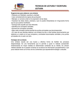 La síntesis es un resumen conciso de las ideas principales y conclusiones más importantes de un texto. Implica leer el texto completo dos veces para identificar las ideas centrales, enlazarlas de manera coherente y redactarlas de forma más breve que el original, manteniendo el sentido general. Una buena síntesis se centra en las ideas clave, evita incluir detalles secundarios o ideas nuevas, y sirve para ordenar y repasar eficientemente los conocimientos abordados en un tema.