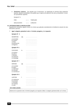 Este documento explica el concepto de antónimos y sus diferentes tipos. Define antónimos como palabras que pertenecen a la misma categoría gramatical pero expresan significados opuestos. Distingue entre antónimos gramaticales, formados por prefijos, y antónimos lexicológicos, que pueden ser absolutos u opuestos totales o relativos u opuestos parciales. Finalmente, presenta criterios y ejemplos para identificar antónimos correctamente.
