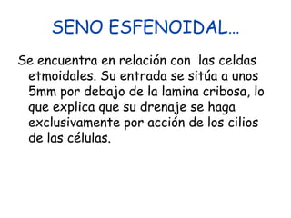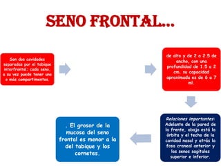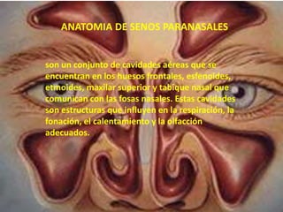 1. Los senos paranasales son cavidades aéreas en los huesos frontales, esfenoides, etmoides, maxilar superior y tabique nasal que comunican con las fosas nasales y cumplen funciones como la humidificación y calentamiento del aire.