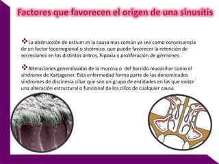 2. La sinusitis es la inflamación de la mucosa de los senos paranasales, la cual puede ser aguda, subaguda o crónica. Los factores que la favorecen incluyen la obstrucción del ostium, infecciones, traumas y alteraciones sistémicas.