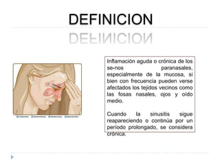 Este documento trata sobre la sinusitis crónica. Define la sinusitis crónica como la inflamación recurrente o continua de los senos paranasales por un período prolongado. Explica que es frecuente en niños debido a adenoides grandes y en adultos por alergias. Describe los tipos de bacterias que causan infecciones y los factores fisiopatológicos involucrados. Finalmente, resume los síntomas, diagnóstico, tratamiento médico y quirúrgico de la sinusitis crónica.