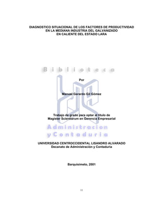 Este documento presenta el diagnóstico situacional de los factores de productividad en la mediana industria del galvanizado en caliente del estado Lara. El objetivo es caracterizar aspectos como la antigüedad de las empresas, su proceso productivo, cultura organizacional, políticas de recursos humanos, sistemas de toma de decisiones y tecnología. El estudio utiliza un enfoque descriptivo con recolección de datos mediante cuestionarios. Los resultados permitirán formular recomendaciones para mejorar la productividad e innovación en el sector.