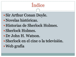 Sir Arthur Conan Doyle creó al famoso detective Sherlock Holmes. Publicó 4 novelas y 56 relatos sobre las aventuras de Holmes y su ayudante el Dr. Watson entre 1887 y 1926. Sherlock Holmes se ha convertido en un icono popular que ha aparecido en muchas películas, obras de teatro, novelas y series de televisión.