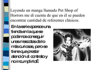 El documento resume varias referencias clásicas encontradas en el manga Pet Shop of Horrors, incluyendo una criatura con forma de sirena que atrae a otros con su canto, haciendo referencia al castigo de Prometeo donde un águila le comía el hígado eternamente. Otra criatura tiene la forma de un "sireno" masculino cuya muerte involucra a una hembra comiéndole las entrañas, similar al castigo de Zeus a Prometeo.