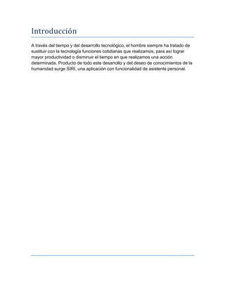 Siri es un asistente personal inteligente desarrollado a partir de investigaciones en inteligencia artificial por el SRI International en 2007 y adquirido por Apple en 2010. Utiliza el procesamiento del lenguaje natural y un modelo que organiza conceptos del mundo real para interactuar de forma más natural con los usuarios. Actualmente, está siendo superado en características por otros asistentes como Google Now y Cortana, mientras que su equipo original ha fundado Viv Labs para crear un asistente más avanzado que aprenda de múltiples fuentes de información.