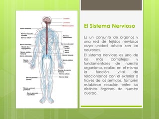 El sistema nervioso está formado por órganos y tejidos nerviosos cuya unidad básica son las neuronas. Consta del sistema nervioso central, que incluye el cerebro, médula espinal y nervios craneales, y el sistema nervioso periférico. El sistema nervioso autónomo regula funciones involuntarias como la respiración y circulación.