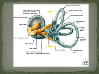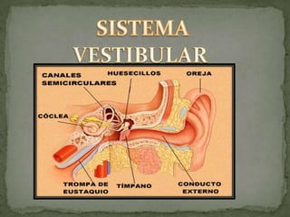 El documento describe el sistema vestibular, su importancia y funcionamiento. El sistema vestibular está formado por el vestíbulo, los canales semicirculares y la cóclea, y es responsable del equilibrio y la orientación espacial. Contiene órganos sensoriales como el útrículo, el sáculo y las crestas ampulares que detectan la aceleración y rotación de la cabeza. El sistema vestibular mantiene la postura y la conciencia espacial a través de la información que envía al cerebro a través del nervio vestib