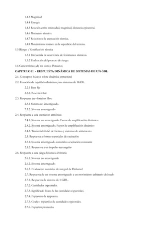 Este documento presenta el syllabus de un curso de diseño sismorresistente. El curso cubre temas como la sismología, la respuesta dinámica de sistemas de un grado de libertad, la dinámica de varios grados de libertad, y conceptos básicos de diseño sismorresistente. El curso evalúa a los estudiantes a través de prácticas calificadas, trabajos, exámenes parciales y finales. Se recomiendan varios libros y normas técnicas para el est