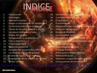 Este documento trata sobre sismología. Explica conceptos clave como placas tectónicas, ondas sísmicas, foco, epicentro y profundidad focal. También describe cómo los terremotos se originan por el movimiento y fricción de las placas tectónicas, y cómo las ondas sísmicas generadas se propagan desde el foco a través de la corteza terrestre. Finalmente, detalla los diferentes tipos de ondas sísmicas como las ondas P, S, Rayleigh y Love, y cómo sus velocidades y efectos