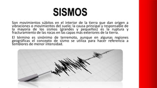 Los sismos son movimientos en la tierra causados por la fractura de rocas. Antes de un sismo, es importante prepararse organizando a la familia, identificando zonas seguras y teniendo un kit de emergencias. Durante un sismo, mantener la calma, ubicarse en una zona segura y tenderse en posición fetal si no es posible llegar a una. Después del sismo, revisar la casa antes de ingresar, cortar servicios si es necesario y estar alerta a posibles tsunamis.