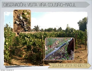 Este documento habla sobre un sistema de monitoreo para viñedos que mide factores ambientales y del suelo. El sistema usa sensores inalámbricos para medir la temperatura, humedad, pH del suelo y más. La información se transmite a una red central para monitorear y controlar las condiciones. El objetivo es mejorar la eficiencia, simplificar el manejo y potenciar la agricultura.